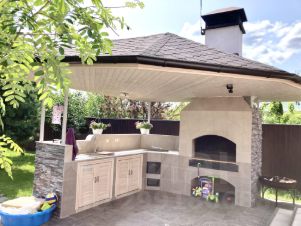 БАНЯ с полностью оборудованной кухней-гостиной, сауна с дровяной топкой, бассейн 4, 5х2, 5 м, с/у, душевая; раздевалка с с/м; в цокольном этаже-бильярдная в англ стиле, стол-12фут; техпомещение с оборудованием для бассейна. На 1 этаже бани - отдельные выходы на крытую террасу и крытую мангальную зону с мангалом, отдельной печью для вок; есть рабочая зона с выводом холодной и горячей воды ( в теплый сезон ).